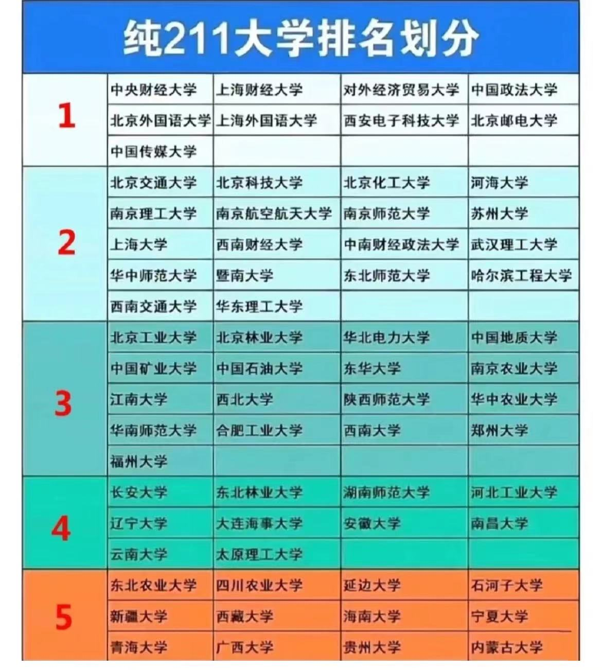 首先图片来源于网络,如有遗漏的211大学还请大家多多包涵。个人感觉这份榜单对于全国各大211高校的档次划分还是相对靠谱的,以第一档211大学为例,我们可以看到两财一贸+两外一政,再加上西安电子科技大学、北邮和中传共同组建了我国211大学的第一梯队。