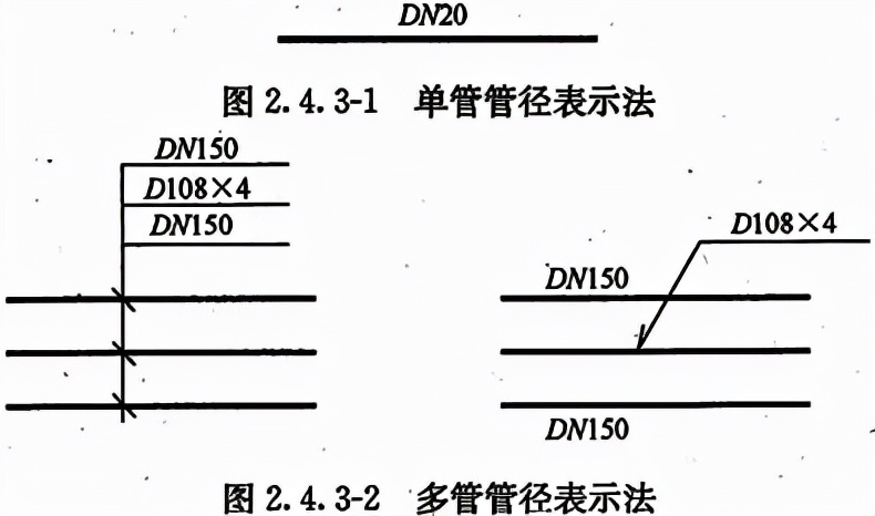 单根管道时,管径应按图2.4.3-1的方式标注;多报管道时,管径应按图2.4.3-2的方式标注。3