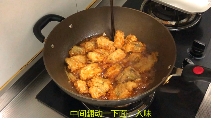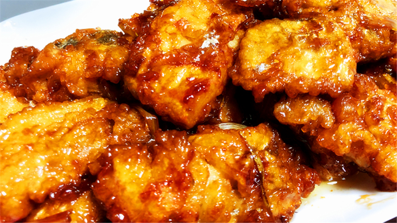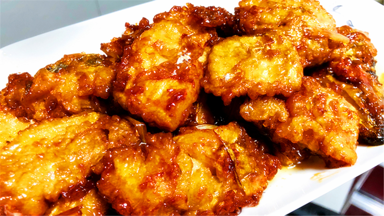 中间翻动一下,让鱼身均匀的粘上糖醋汁就可以了,如下图,这样做好的糖醋带鱼,颜色红亮,味道鲜香,吃起来特别有食欲。酸甜可口