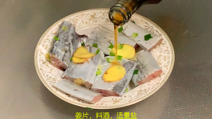 把带鱼段放入盘里,倒上料酒,姜片,盐,腌制20分钟
