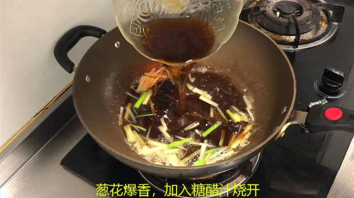 油锅加热,放入葱花姜末爆香,倒入糖醋汁烧开,加入水淀粉勾芡,然后把炸好的鱼倒进去,煮到水收汁