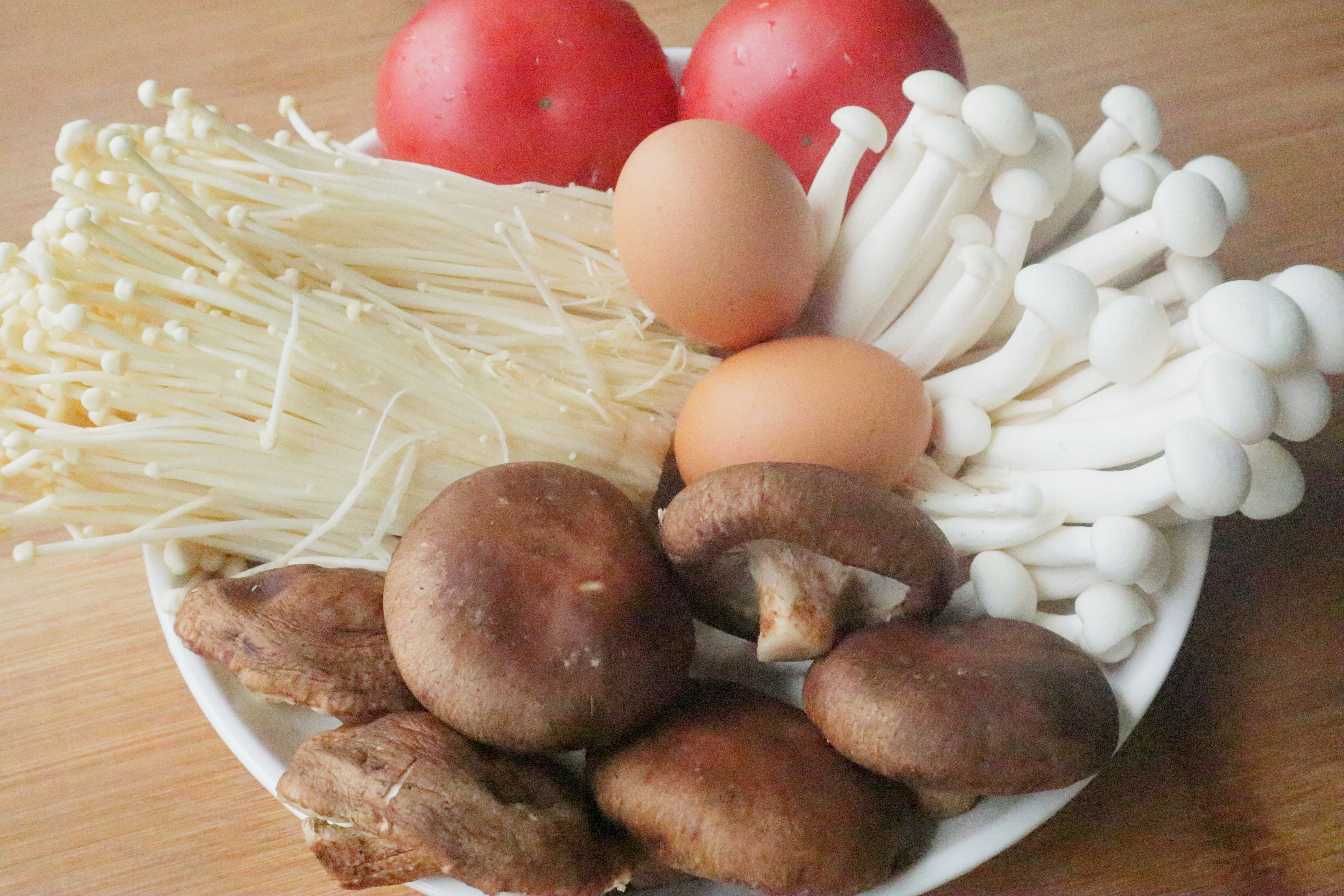 【所需食材】:西红柿2个、鸡蛋2个、葱一段、菌菇一盘(香菇、白玉菇、金针菇、大蒜几瓣、香菜一段。