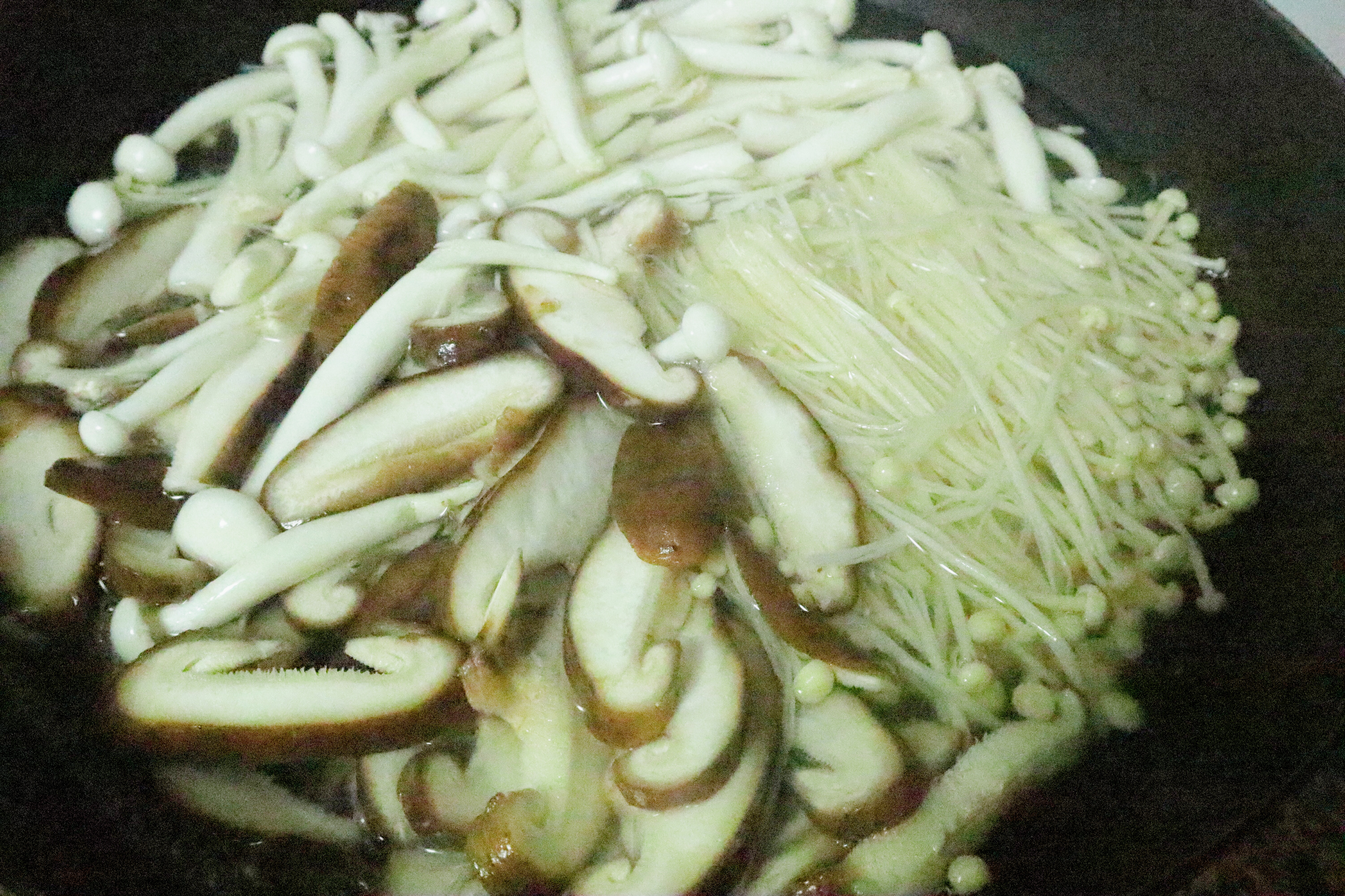 第四步:加一勺生抽调味,倒入一大碗清水,一次把水加足,中途加水煮出来的汤不好喝了。煮沸后加入香菇、白玉菇、金针菇,转中小火煮3分钟。