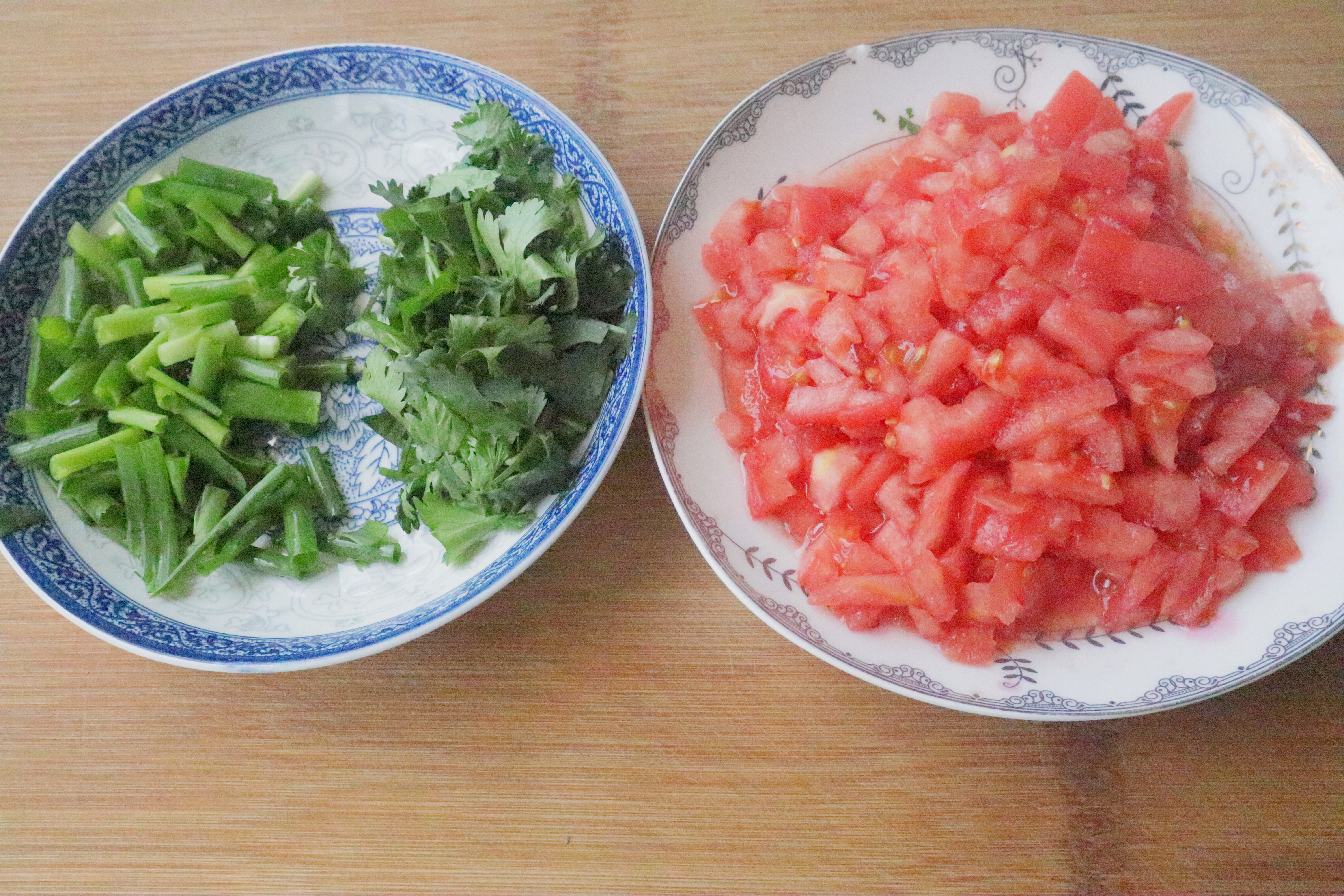 第一步:西红柿清洗干净,顶端划十字刀,放入开水里烫10秒后捞出,去皮切小块;香菜、葱切断,蒜拍扁切末。