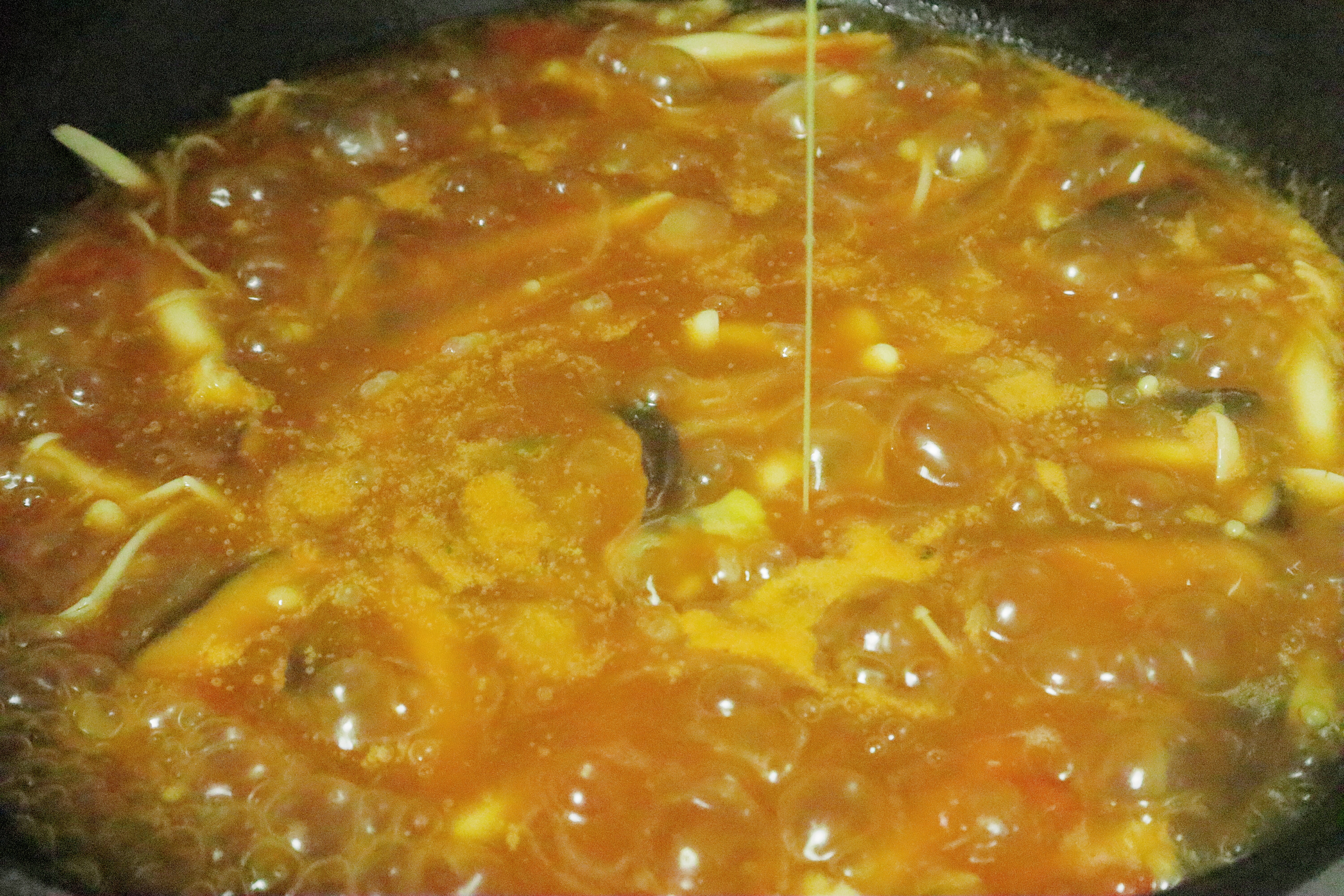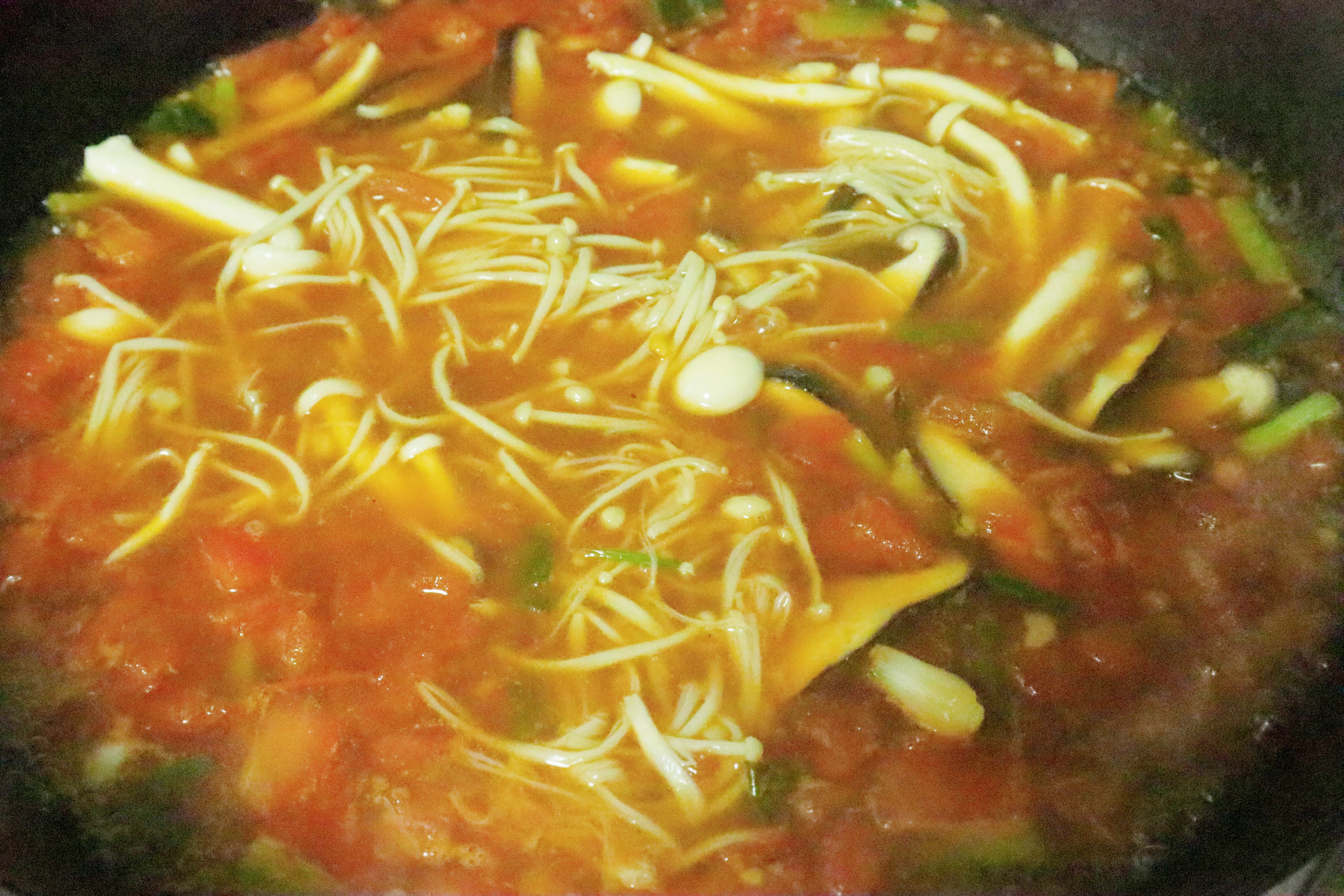 白玉菇本身非常鲜美,无论炒菜、炖煮、烧烤,加热后能迅速释放出海鲜的味道,不需要过多调味品。蘑菇类食材的口感极佳,酸甜多汁的西红柿有上色和增味效果,两者熬煮的汤色、香、味俱全,用来当早晚餐非常合适,解馋又管饱。