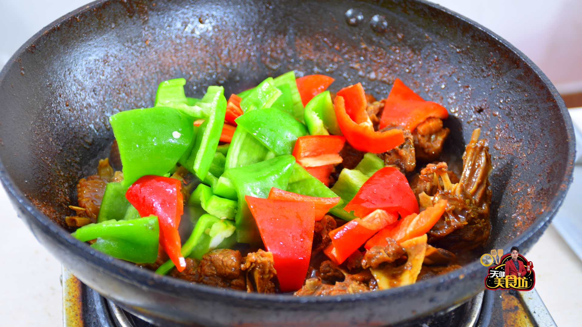 第四步:等汤汁收浓时,放入青红椒块,再快速翻炒至断生,即可出锅装盘!