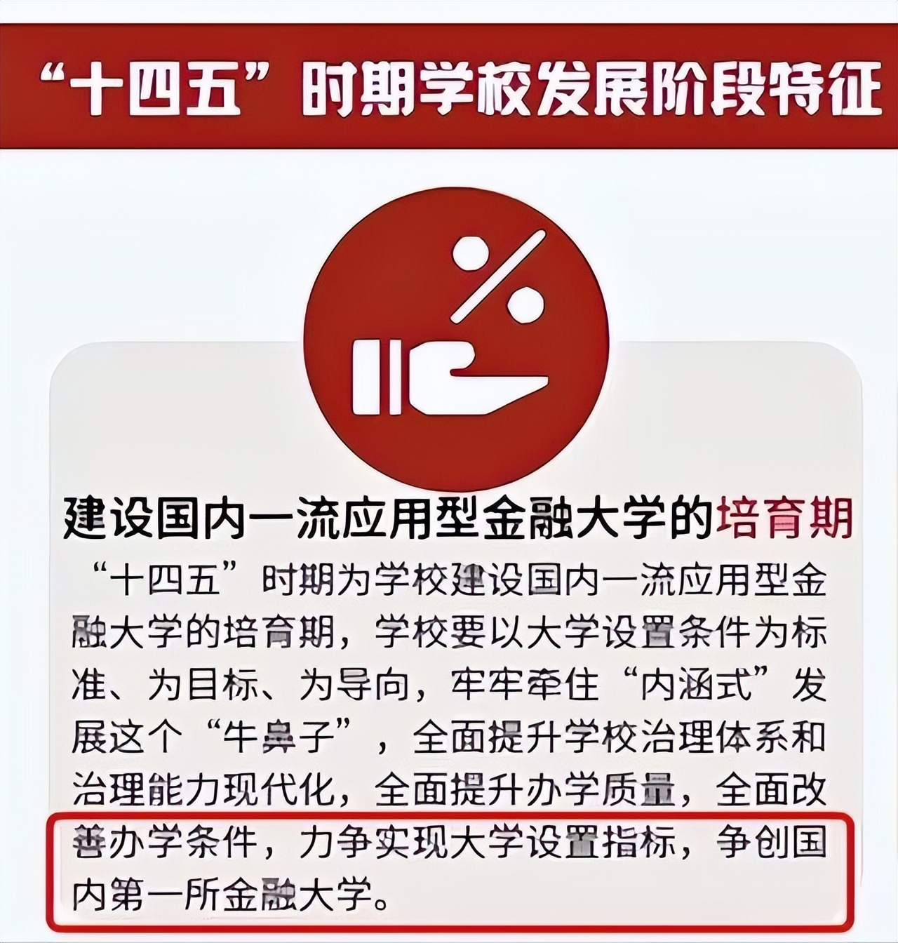 据悉,广东金融学院将在十四五期间,建设成国内一流应用型金融大学的培育期,要以大学设置条件为标准、为目标、为导向,全面提升办学质量,全面改善办学条件,力争实现大学设置指标,争取做到国内第一所金融大学。