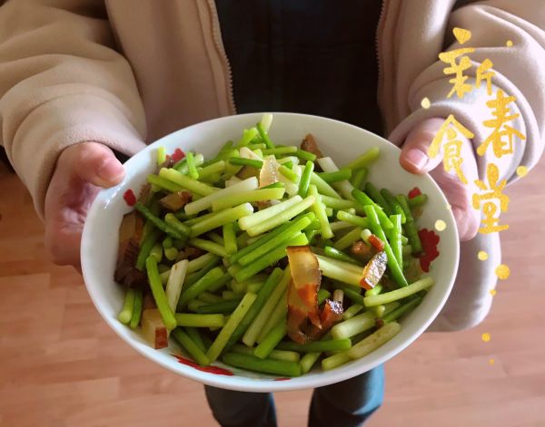 5、菜谱二:腊肉炒蒜苔 蒜苔切节,下锅中煸干多余水份,加少量盐。