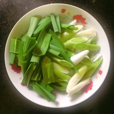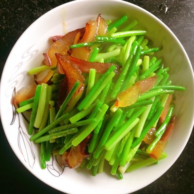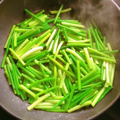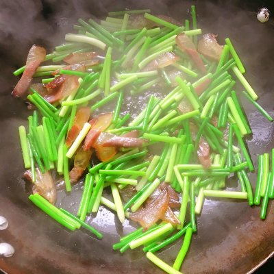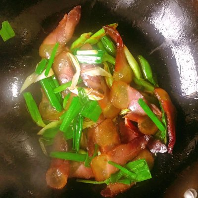4、最后加入蒜苗叶,少量盐和味精即可起锅。 腊肉炒蒜苗就做好啦!