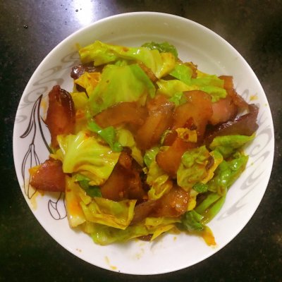 14、把腊肉铲一边,油中加一点点豆瓣酱,加入莲白合炒,最后加适量味精。