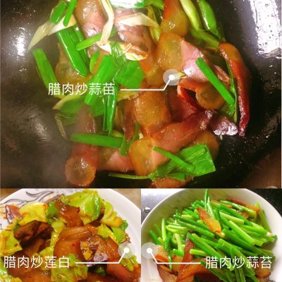 过年期间腊肉吃腻了吗? 试试用来炒菜吧,超多组合,荤素搭配好吃不油腻~ 本菜谱内共有三道菜,依次是: 腊肉炒蒜苗 腊肉炒蒜苔 腊肉炒莲白