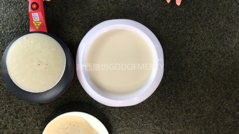 3.20秒预热薄饼机,将薄饼机在面糊盆沾一下,挂满面糊,快速提起来
