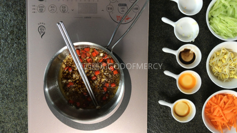 5.胡萝卜和黄豆芽在锅中提前焯熟,芝麻酱用开水懈开后,辣椒油,生抽,醋,盐,香油拌匀备用