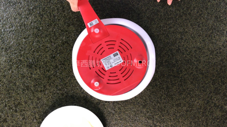 4.薄饼机翻过来,只需等上10几秒,将薄饼机的薄饼扣在盘子上,一粘、二翻、三扣,只要1分钟一张面膜大小的凉皮就制作完成啦,叠起来切成段