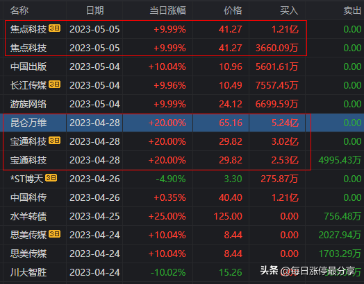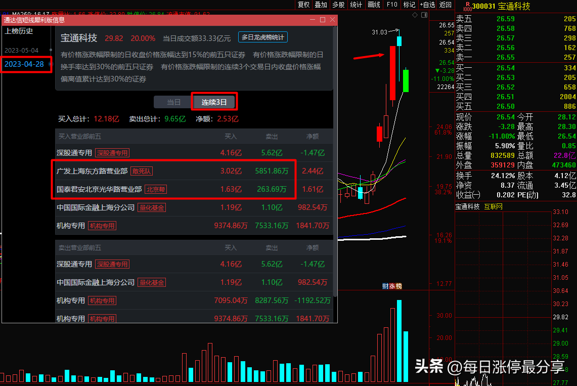 这两个席位是否眼熟?没错,他们在昆仑万维分别买入5.91亿、5.24亿!在宝通科技又分别买入1.63亿、3.02亿!(该游资的个股,后续两天的表现不太理想)
