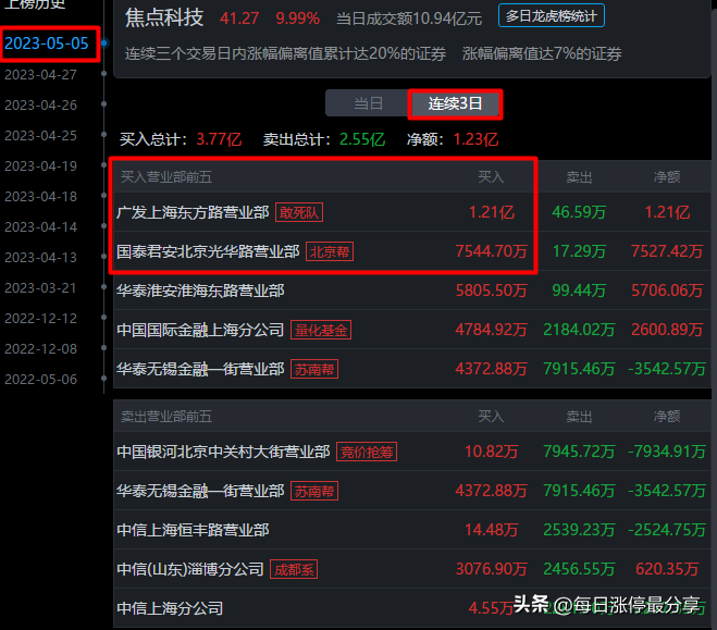更精彩的是3日榜数据,3个交易日内,上海东方路买入1.21亿,北京光华路买入7544万!
