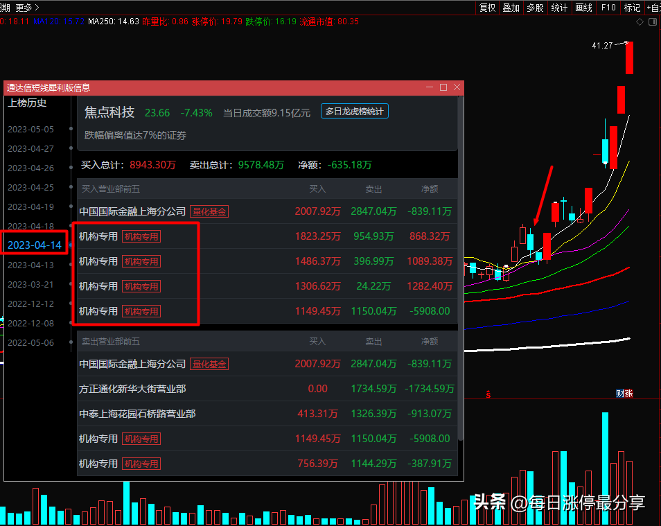 4月14日,焦点科技下跌7.43%,但4大机构依然在里面活跃。(可以猜出有机构在持续运作)