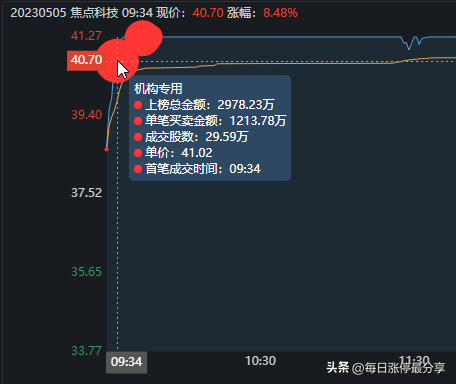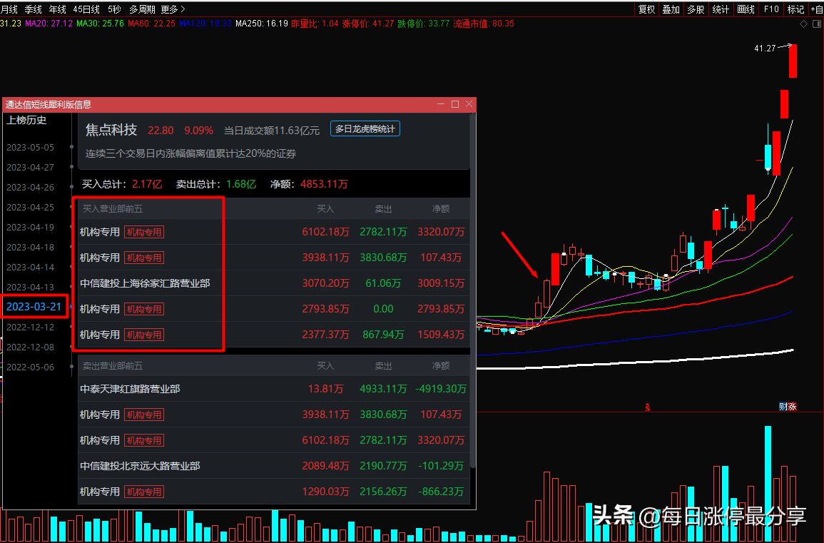 3月21日,焦点科技出现了炸板,收涨9%,龙虎榜数据显示4大机构霸榜入场,分别买入6102万、3938万、2793万、2377万。(看过我复盘文章的朋友,应该知道我对机构霸榜的个股比较有兴趣,我会单独列一个机构分组,机构搭巢,容易吸引游资进驻。还有涨停放量突破年线的个股,我也会单独列一个分组,从一个趋势强势进入另外一个趋势。2023年,新规的刺激下,可以说是趋势股低吸最好的时代)