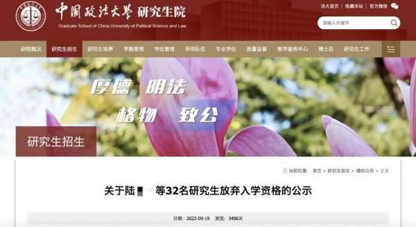 2021年9月16日,中国政法大学研究生院发布公告,宣布拟取消38名2021级研究生入学资格。