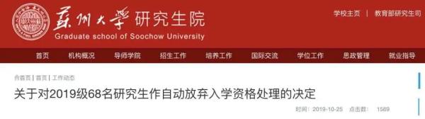 早在2019年10月25日,苏州大学研究生院就曾发布公告,该校68名2019级研究生因未按学校规定办理入学手续,经学校审议,对他们作自动放弃入学资格处理。