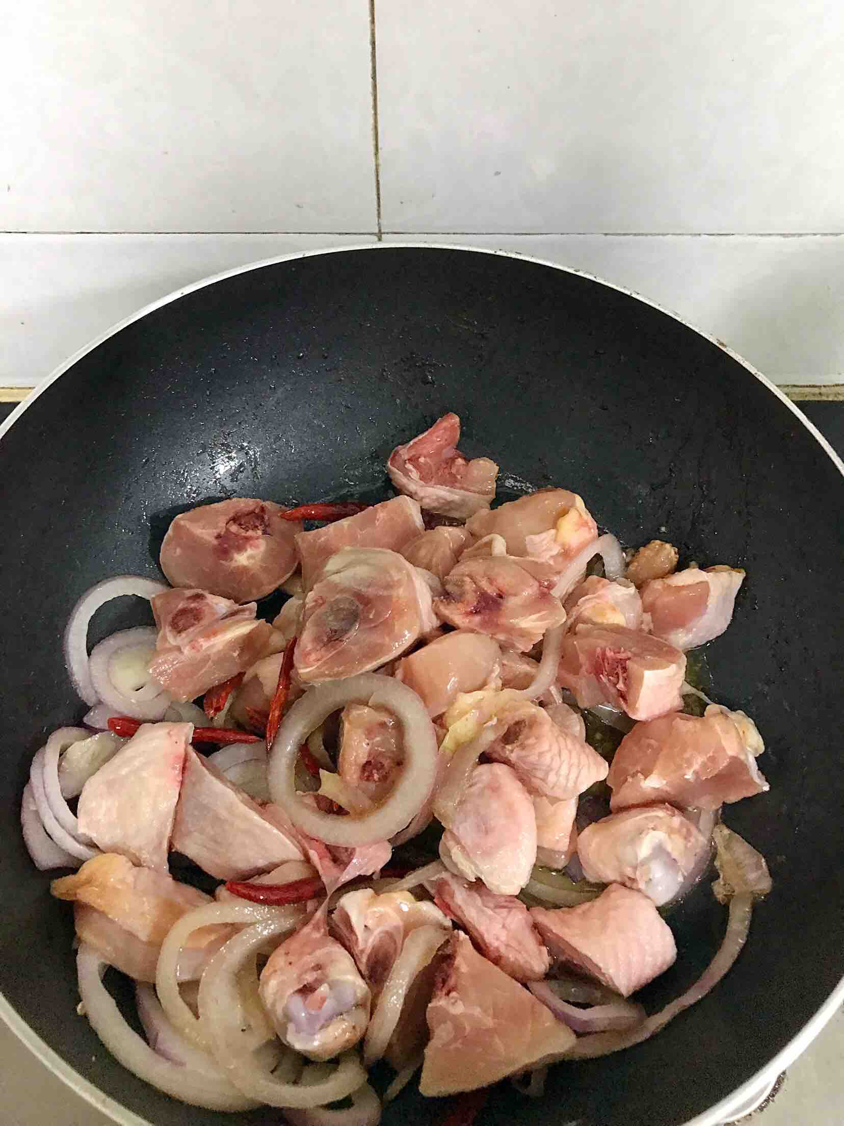 2.倒入切块的鸡腿肉,翻炒至三分熟