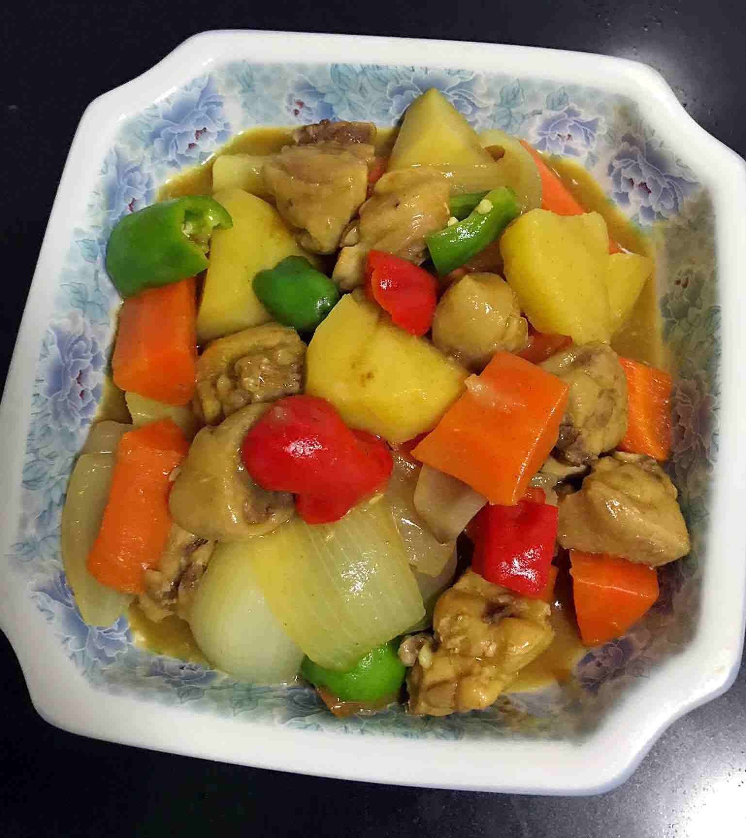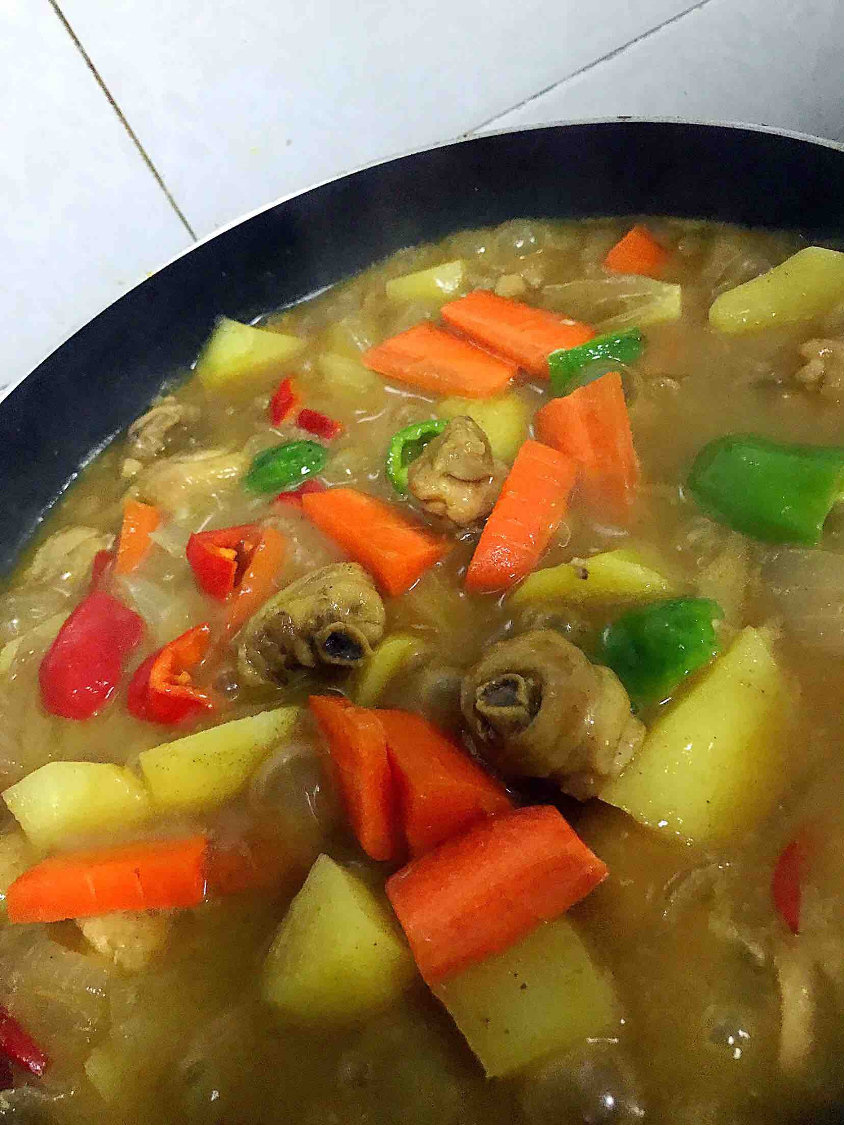 2、小火炖 慢慢熬汤 让咖喱味融入鸡块 味道更鲜美 。