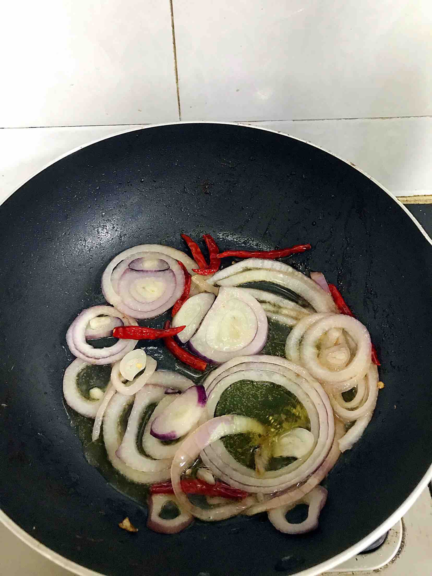 1.将洋葱切圈,干红椒洗净,锅烧温加入适量油,倒入洋葱圈、干红椒