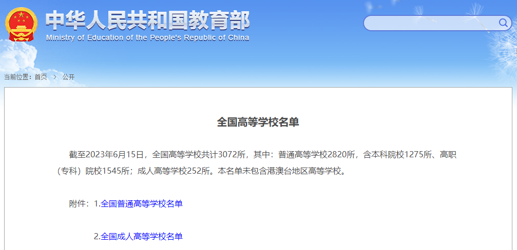 近日,教育部发布了全国高等学校名单,根据2023年全国高等学校名单,截至2023年6月15日,全国高等学校共计3072所,其中:普通高等学校2820所,含本科院校1275所、高职(专科)院校1545所;成人高等学校252所。