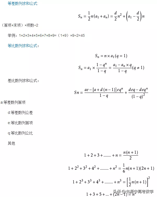 (1)a(n+1)--a(n)=d (d为常数、n ∈N*)[或a(n)--a(n-1)=d,n ∈N*,n ≥2,d是常数]等价于{a(n)}成等差数列。(2)2a(n+1)=a(n)+a(n+2) [n∈N*] 等价于{a(n)}成等差数列。(3)a(n)=kn+b [k、b为常数,n∈N*] 等价于{a(n)}成等差数列。(4)S(n)=A(n)^2 +B(n) [A、B为常数,A不为0,n ∈N* ]等价于{a(n)}为等差数列。