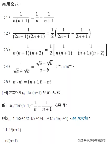 适用于分式形式的通项公式,把一项拆成两个或多个的差的形式,即an=f(n+1)-f(n),然后累加时抵消中间的许多项。