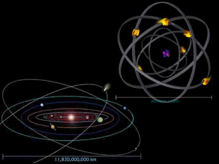 原子由原子核和电子构成,原子在中心,电子在周围绕原子运动,就像太阳系行星绕太阳公转;原子核和电子所占的空间是整个原子的极小一部分,其他绝大部分是空的,太阳系内绝大部分空间也是没有任何天体;电子有自旋,行星也在自转……看起来,这个宇宙的确令人感到不可思议,没想到极其巨大的天体竟然和微观世界的粒子有如此高的相似性。但问题在于,真是如此吗?