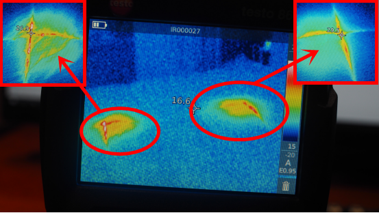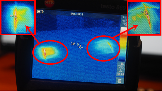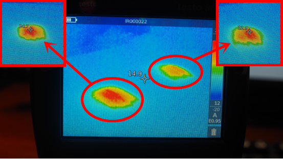 热成像图片拍摄时,因角度不同,颜色会有大幅偏差,因此在下面的图片中,颜色仅作为参考,实际以测量温度为准。