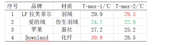 各款不同材质冬被热成像最高温数据统计如上 ▲