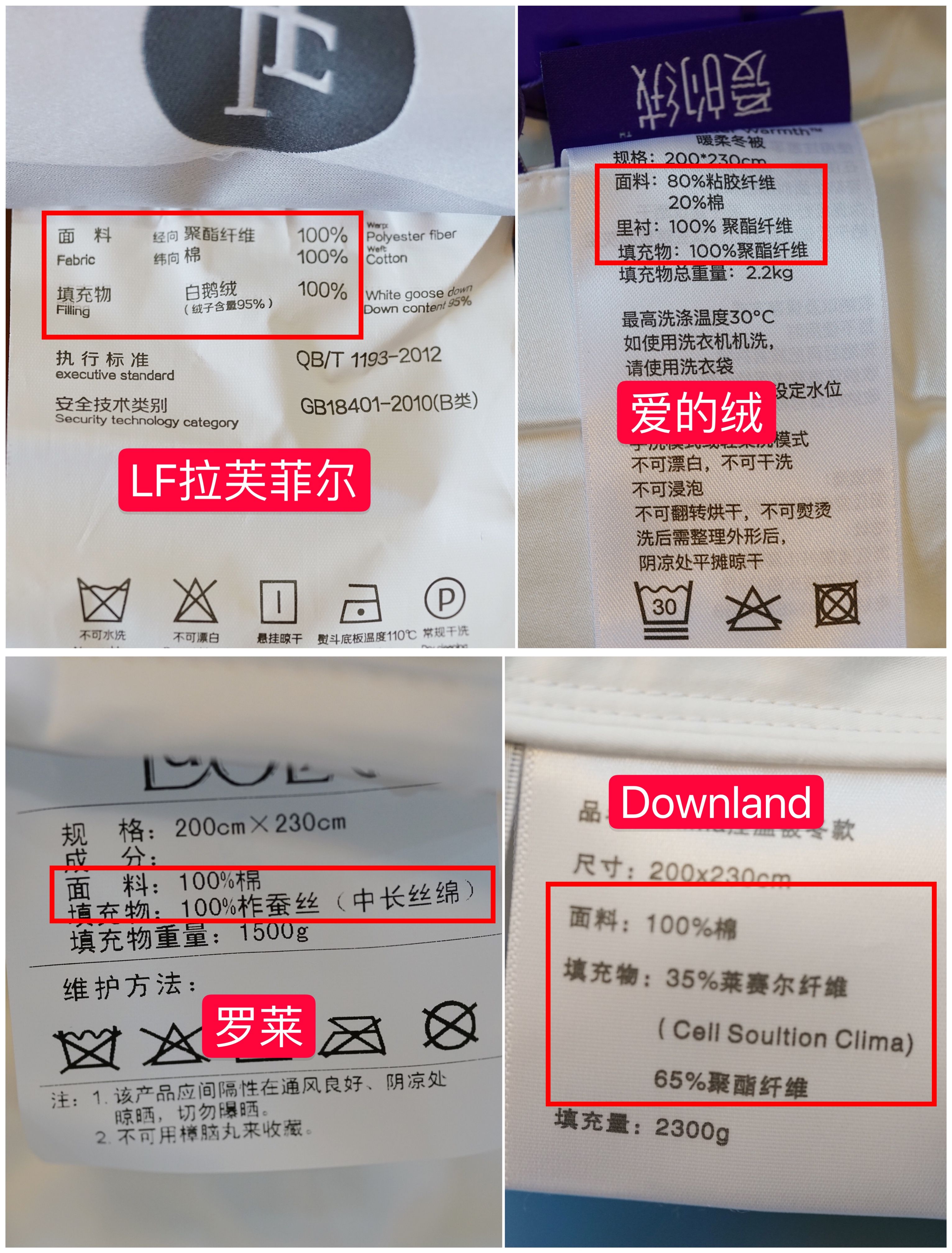 二、材质简介文章中涉及的四种不同材质的冬被品牌分别为:Downland-化纤;爱的绒-仿生羽绒(化纤);LF拉芙菲尔-羽绒以及罗莱-蚕丝 ▲