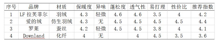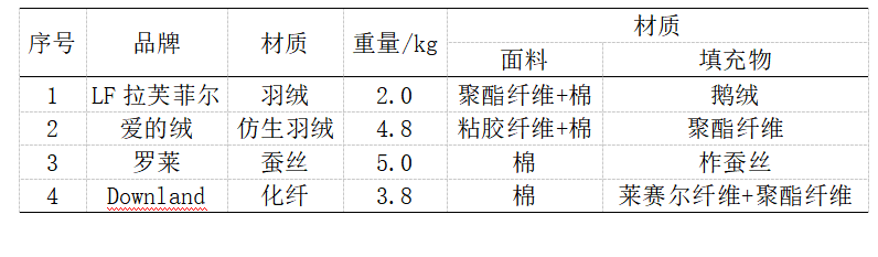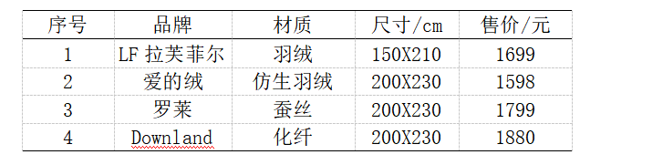这张表格中,楼主列出了本文要对比的四款不同品牌不同材质的冬被 ▲