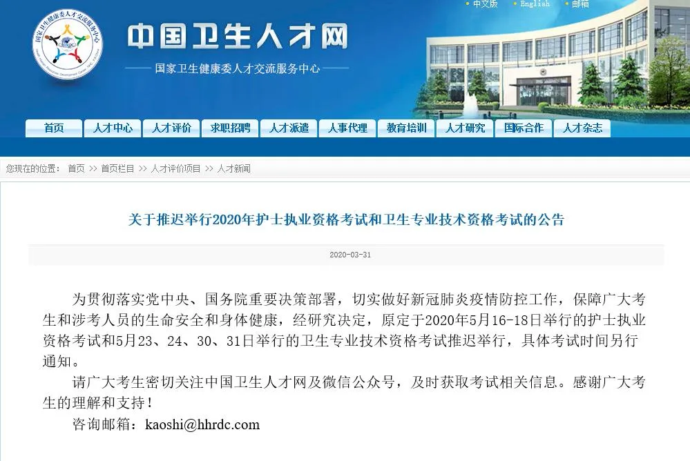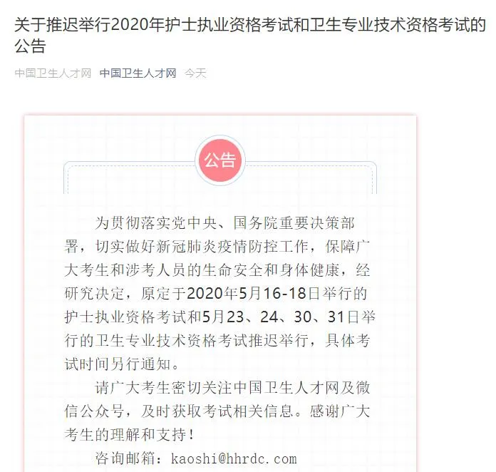 2020年愚人节的前一天上午10点左右,微信认证为“国家卫生健康委人才交流中心”的公众号“中国卫生人才网”推送了一条重磅消息:关于推迟举行2020年护士执业资格考试和卫生专业技术资格考试的公告。原定于五月中下旬的2020年护士执业资格考试和卫生专业技术资格考试全部推迟,具体考试时间另行通知。