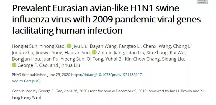 6月29日,PNAS发表的一篇论文《Prevalent Eurasian avian-like H1N1 swine influenza virus with 2009 pandemic viral genes facilitating human infection》中,介绍了一种可能引发大型流行病的新型猪流感病毒。知名院士高福也在作者之列。