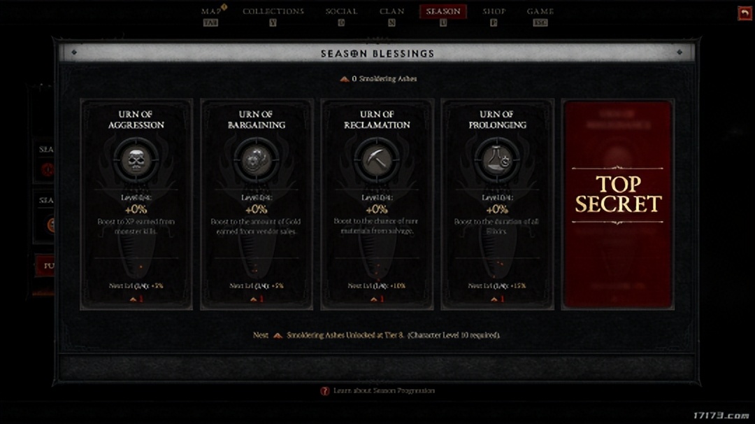 闷烧余烬是可以用来获得赛季祝福的资源,而根据不同的祝福,玩家将能获取经验值的额外加成、金币,或古币。玩家同时可以启用超过一种的赛季祝福,也可以用额外余烬来升级获取的额外奖励。