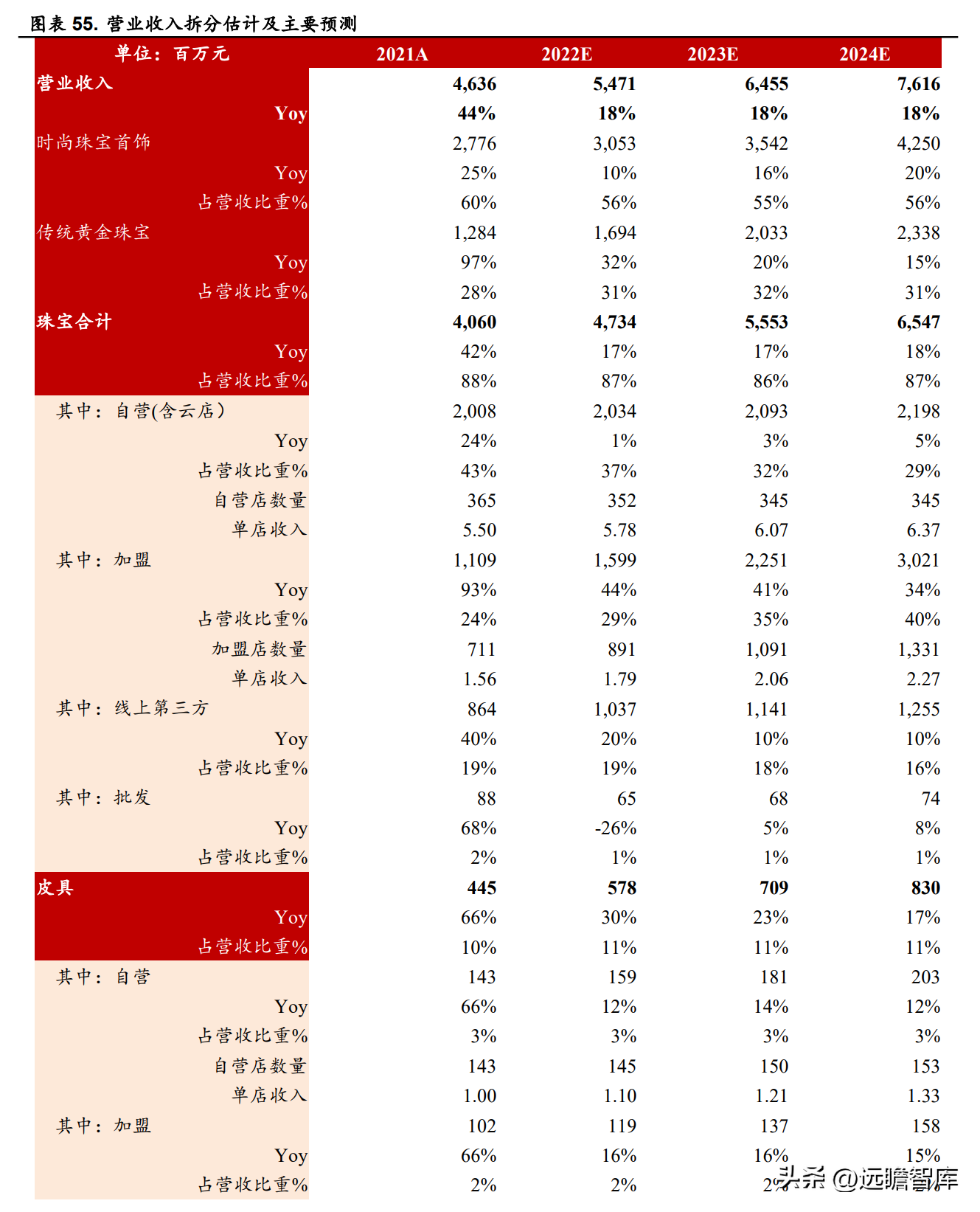 预计 2022-2024 年时尚珠宝首饰收入增速分别为10%/16%/20%,传统黄金珠宝收入增速分别为32%/20%/15%。