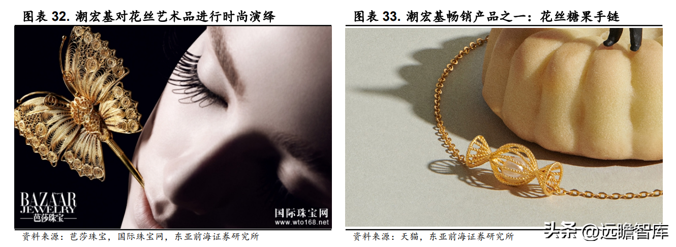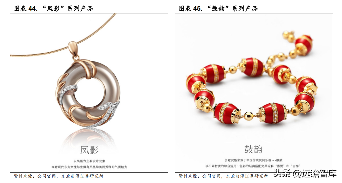 产品方面,近年随着市场黄金热潮的兴起,公司在保证 18K 优势工艺的基础上,延伸开发 5G 黄金、古法黄金产品,区别市场厚重的传统款式,推出轻巧、时尚感较强的产品并引入 IP 产品,如 2021 年推出的“IN+系列”“臻金?致钻系列”等 5G、古法金产品,与花西子联名推出的“并蒂同心”“一生锁爱”以及“心之锁向”等足金产品,通过黄金时尚化提升公司业绩。