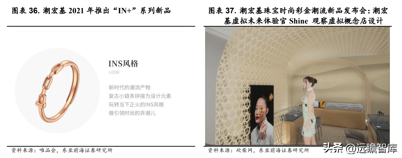 形式方面,自 2013 年起公司每年发布彩金潮流,如 2021 年,公司通过三地协同、云端融合的方式,引入“元宇宙”概念以虚拟人和现实主持人在复刻的潮宏基臻宝博物馆和珠宝店等虚拟空间的形式,推介年度最新推出的时尚彩金新品。