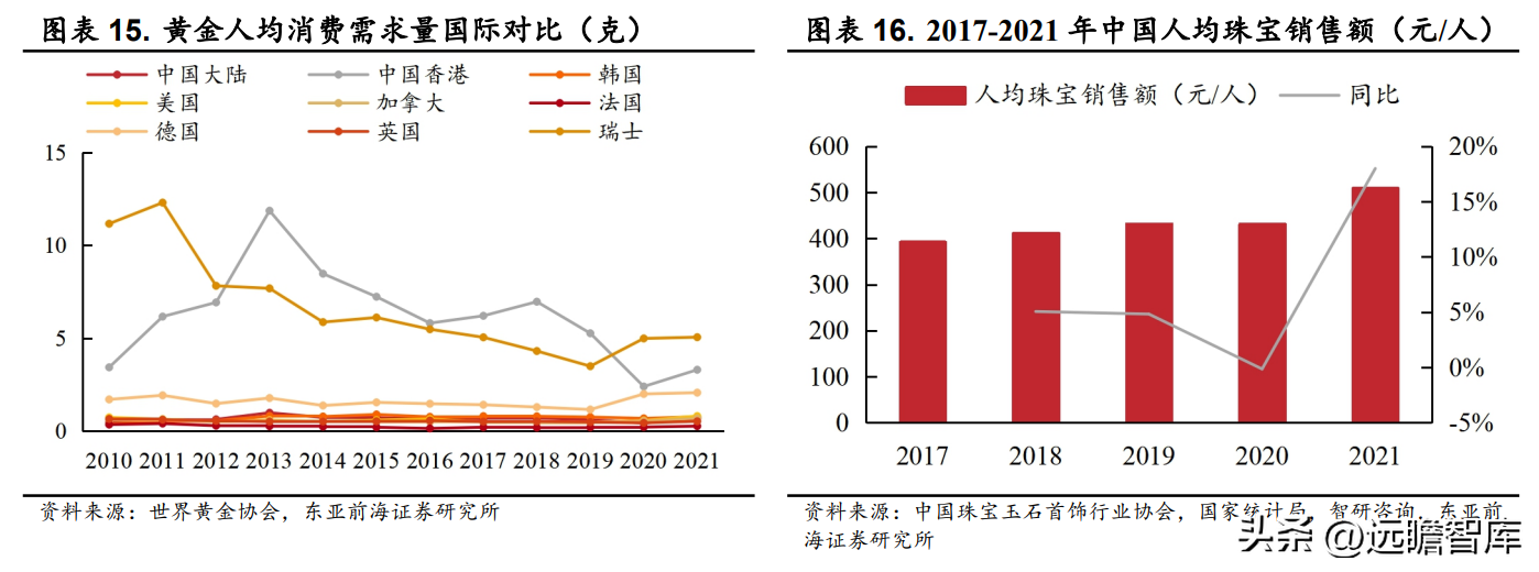 以我国香港地区为例,黄金人均消费需求量历年在发达国家及地区排名中名列前茅;大陆地区人均黄金需求量亦可比肩美国、加拿大等发达国家,2021 年人均珠宝销售额约 509.7 元。