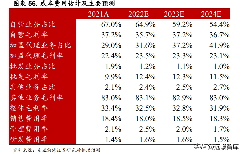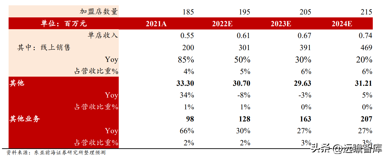 分渠道看,增长驱动力主要在于加盟渠道拓展,预计 2022-2024 年分别 净增加 180/200/240 家店,随着新增加盟店成长同店效益逐步提升,假设 2022-2024 年单店收入增速约 15%/15%/10%。