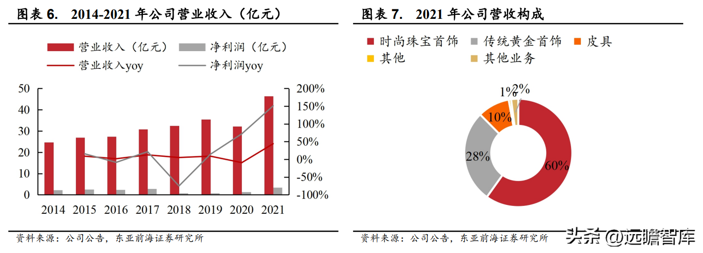 公司业务以珠宝、女包业务为主,规模稳步扩张,近两年利润增长显著。