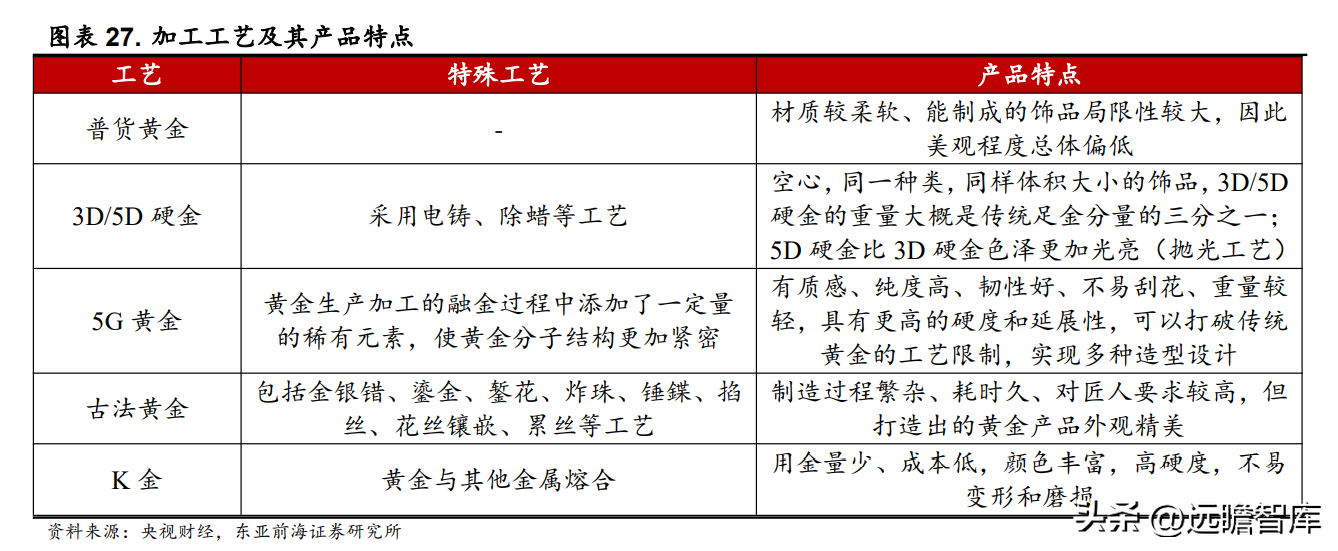 随着消费观念逐渐改变,我国黄金珠宝不再强调高纯度,3D/5D 黄金、5G 黄金、古法黄金等加工工艺相继出现并迅速扩大市场份额,标志着行业进入追求产品工艺和文化的阶段。K 金是为提高黄金的硬度,在黄金中加入了少量了银、铜、镍等其他金属所熔炼而成,如 18K 金为“75%金+25%贵金属”所合成。其优势主要在于: