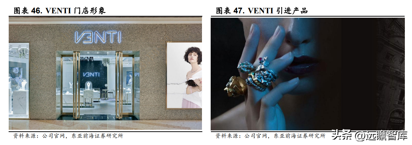 不同品牌来看,“CHJ 潮宏基”、“VENTI 梵迪”品牌标签鲜明,且时尚定位相较传统珠宝具备定位区隔,其设计前沿、迎合国潮符合当下年轻群体消费趋势,对区域性品牌加盟商而言,品牌进驻更多是吸引年轻增量流量而并非是在原有客群的基础上加剧竞争。