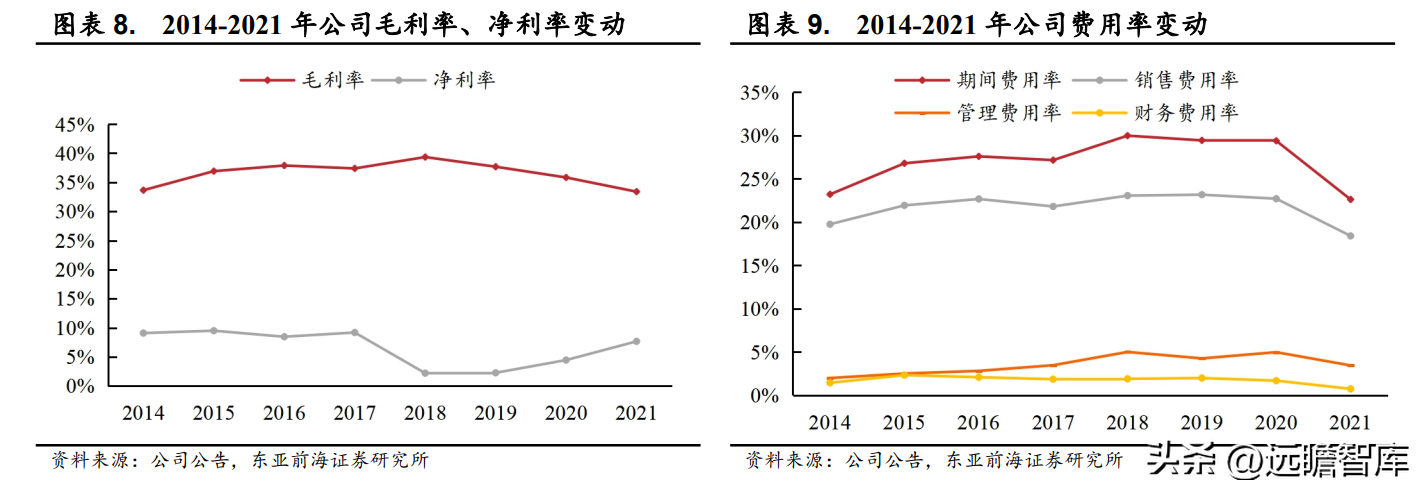 2021 年,公司转变渠道策略,借力加盟拓展实现二次增长,同时带动费用率显著下行,2021 年销售/管理/财务费用率分别下降至 18%/3%/1%,较上年分别下降 4.29PCT/1.53PCT/0.95PCT。