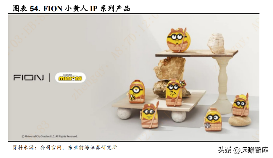 具体产品层面,FION 持续与跨界艺术家/知名 IP 联乘合作,成功推出“斗鱼”“苹果”“油画”“JAYDE FISH”等艺术联名系列产品,以及“皮卡丘”“小黄人”“侏罗纪”等国际一线 IP 系列产品, 同时打造自己的“小怪兽”IP 系列产品,备受市场青睐。