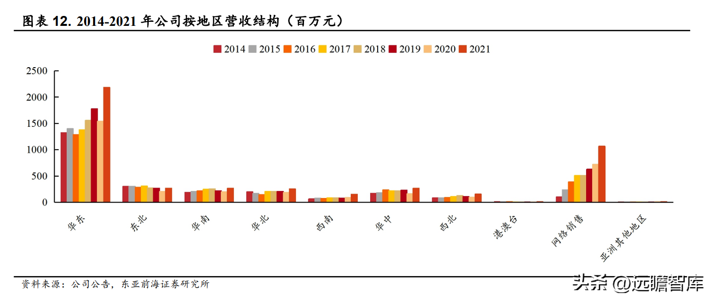 华东地区收入占营收近半壁江山,网络销售占比提升趋势明显。华东地区是公司最重要的销售收入来源,2021 年收入规模达 21.87 亿元,占营收比重达 47%;网络渠道近年来销售规模提升迅速,2021 年贡献营收达 10.66 亿元,占营收比重达 23%;东北/华南/华北/华中区域销售体量相当,2021 年贡献总收入比重均约 6%,另西南/西北/港澳台地区收入占 比较小,分别约 3%/3%/0%。