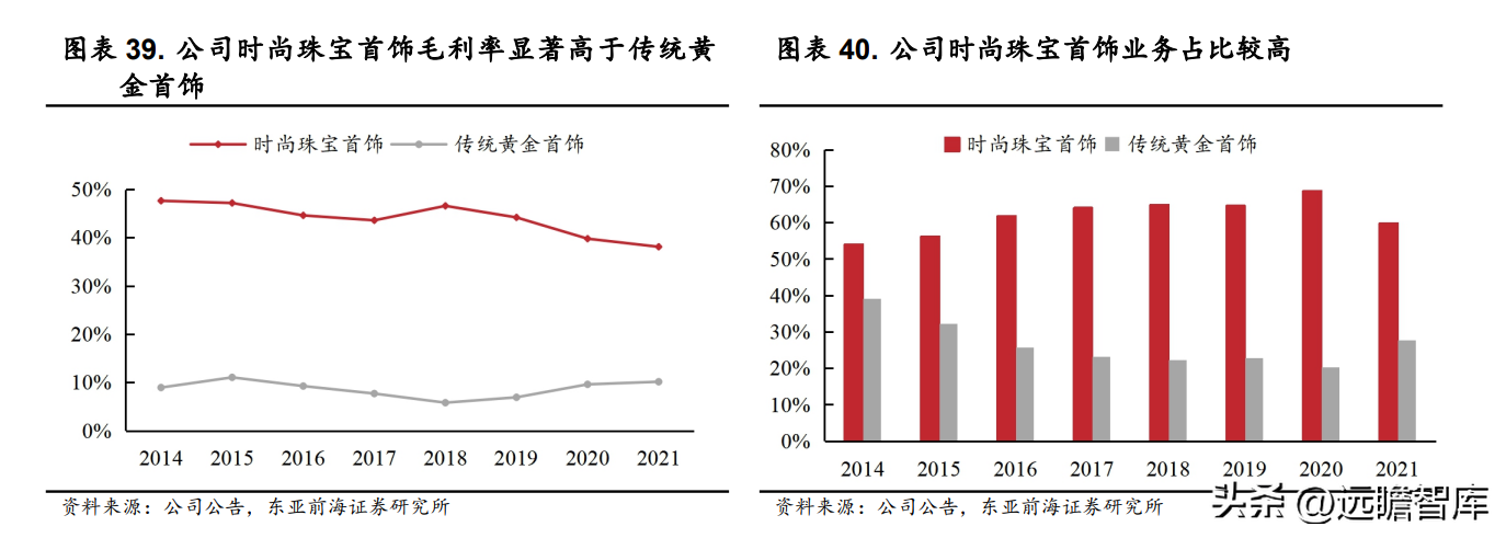 依托原创、独特的产品设计及优秀工艺,公司时尚珠宝业务相较传统珠宝首饰实现了显著的品牌溢价。近年来公司时尚珠宝首饰业务(以件计价模式)、传统黄金首饰(以克重计价模式)毛利率分别落在40-50%、5-15%。